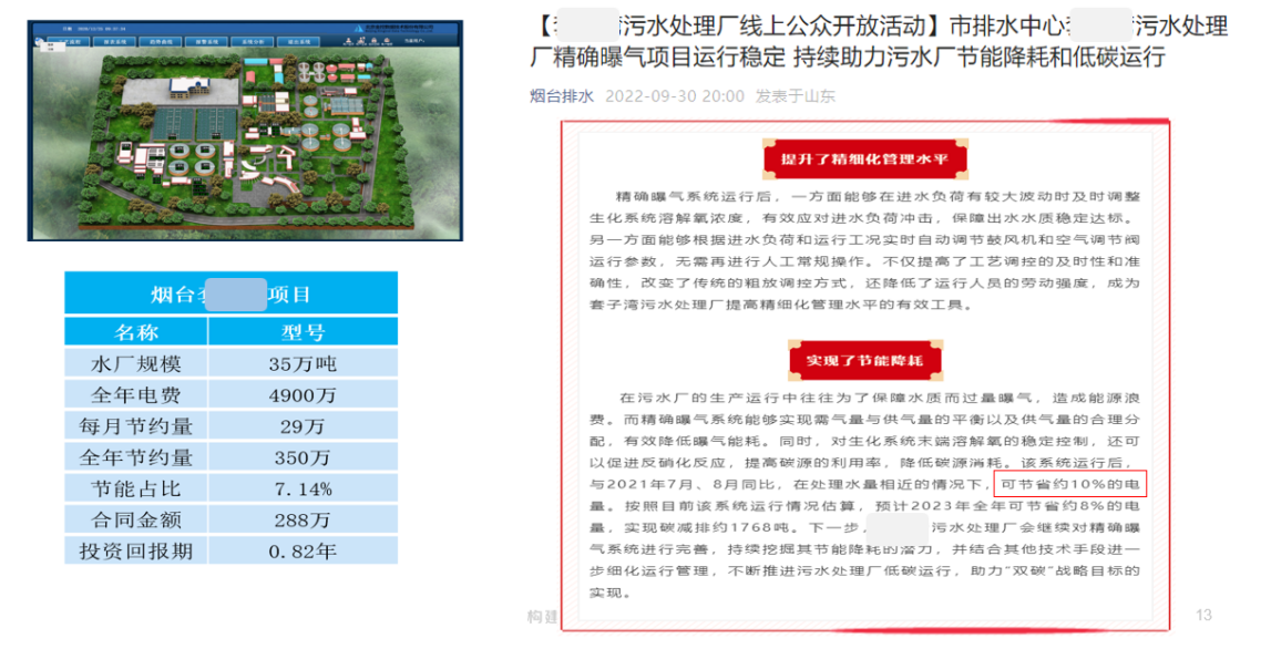 煙臺市某污水廠,每日處理能力35萬噸,對全廠曝氣系統進行智能化升級,可節電10%,不到1年,收回建設成本。